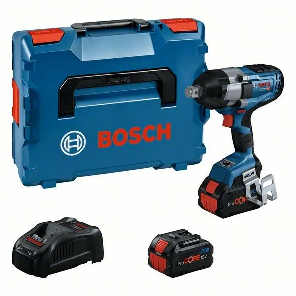 „Akku-Drehschlagschrauber GDS 18V-1050 HC, Für anspruchsvolle Anwendungen, die volle Leistung erfordern: Der Drehschlagschrauber GDS 18V-1050 HC Professional mit BITURBO Brushless-Technologie liefert höchste Leistung und eine Betriebsarteinstellung. Die integrierte BITURBO Brushless-Technologie ist voll optimiert für ProCORE18V-Akkus und bietet ein starkes Anziehmoment von 1.050 Nm und Losbrechmoment von 1.700 Nm. Hohe Vielseitigkeit durch zwei Standardbetriebsarten am User Interface: Metallmodus (A) und Holzmodus (B), zum Verhindern von gebrochenen Schraubenköpfen und den Verlust von Metallschrauben oder -muttern, indem der Drehschlagschrauber verlangsamt oder ausgeschaltet wird. Alle Betriebsarten lassen sich schnell über die Bosch Toolbox App individuell einstellen. Drei verschiedene Geschwindigkeits-/Drehmomentstufen sorgen für höhere Flexibilität und Kontrolle. Der GDS 18V-1050 HC Professional ist der Drehschlagschrauber mit voller Leistung zum Anziehen und Lösen von Metallschrauben und -muttern bis M 24 bei verschiedensten Arbeiten wie Stahlbaukonstruktionen, Rohrmontage, Fahrzeuginstandhaltung oder Verwendung von Schrauben/Ankerbolzen in Holzkonstruktionen. Er ist kompatibel mit allen Bosch Professional 18V-Akkus und -Ladegeräten (Professional 18V System); für maximale Leistung ProCORE18V ≥ 5,5 Ah verwenden. Der GDS 18V-1050 HC Professional verfügt über Electronic Cell Protection (ECP), Electronic Motor Protection (EMP), Werkzeugstatusanzeige mit LED-Licht, Aufbewahrungsclip und 3/4″“-Werkzeugaufnahme mit Sprengring und Sicherungsbohrung. 1 x Bluetooth Low Energy Modul GCY 42 Professional (1 600 A01 6NH); 2 x Akku ProCORE18V 8.0Ah (1 600 A01 6GK); Schnellladegerät GAL 1880 CV (1 600 A00 B8G); 1/1 L-BOXX-Einlage für Gerät und Ladegerät (1 600 A02 58Y); L-BOXX 136 (1 600 A01 2G0)“