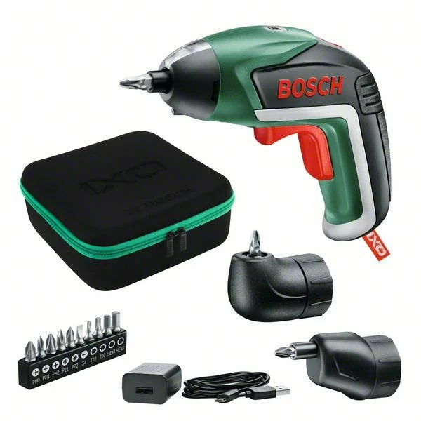 Akku-Schrauber IXO 5 Full Set – mit Winkel-Aufsatz und Exzenter-Aufsatz, Der kleine Riese von Bosch, Ergonomisches Griffdesign für mehrere Griffpositionen, Power-LED mit Spot- und Streulichtmodus, Micro-USB-Ladegerät für mobile Anschlussoptionen, Einfache Möbelmontage und -demontage, schnelles Anziehen oder Lösen von Schrauben, Lithium-Ionen-Technologie ohne Memory-Effekt oder Selbstentladung des Akkus, Exzenter-Aufsatz (1 600 A00 1YA), Winkel-Aufsatz (1 600 A00 1Y8), 10 Standard-Schrauberbits, USB-Ladegerät, Karton