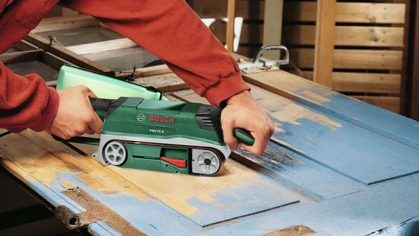 Bandschleifer PBS 75 A. Schleifen mit hoher Effizienz und hohem Komfort. Effektives Schleifen – leistungsstarker 710-W-Motor sorgt für einen hohen Materialabtrag. Handlichkeit – kompakt und mit abnehmbarem Zusatzhandgriff für eine optimale Handhabung. Komfort – automatisches Bandsystem zentriert das Band während des Arbeitsvorgangs. Microfilter-Staubbox reduziert Staub für mehr Sauberkeit im Arbeitsbereich. Ideal zum Schleifen größerer ebener Flächen aus verschiedenen Materialien, von Holz bis Metall. Im Lieferumfang enthalten: 1 Schleifband K 80, Kartonschachtel