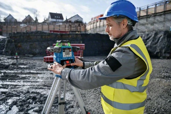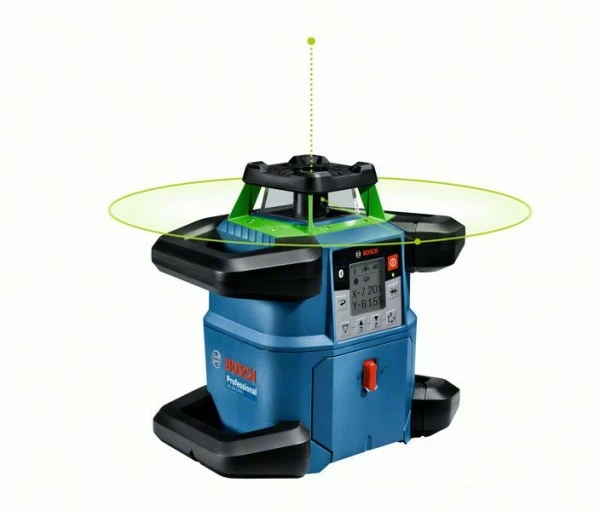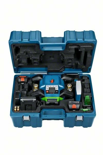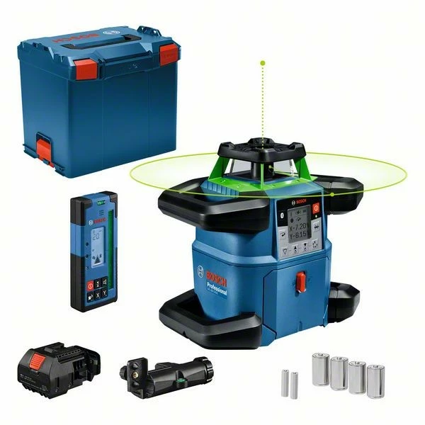 Rotationslaser GRL 650 CHVG, Der robuste Rotationslaser GRL 650 CHVG Professional mit Bluetooth®-Konnektivität setzt neue Maßstäbe für Präzision und Effizienz beim Nivellieren auf der Baustelle. Grüne Lasertechnologie sorgt für eine bessere Sichtbarkeit bei unterschiedlichen Lichtverhältnissen. Der strapazierfähige Rotationslaser eignet sich für die Verwendung bei rauen Baustellenbedingungen und schlechtem Wetter, übersteht Stürze bis zu 2 m bei umkippendem Stativ und erfüllt die IP68-Anforderungen zum Schutz gegen Staub und Wasser. Die Verwendung der Levelling Remote App für die Einstellungsübersicht und Fernbedienung spart Zeit und erlaubt volle Konzentration auf die Arbeit. Der vielseitige GRL 650 CHVG Professional eignet sich besonders für Nivellier- und Planierarbeiten im Außenbereich sowie für die Installation von Wänden, Decken und Klimaanlagen im Innenbereich. Eine lange Laufzeit für mehr Komfort durch die Wahl zwischen zwei Optionen: 18-V-Li-Ion-Akku von Bosch oder Alkali-Batterien (Monozellen). Optimaler Komfort dank High-Tech-Ausstattung wie Display, Doppelneigungsfunktion, Neigungsspeicherung und hochwertiger Empfänger (LR 65 G Professional). Laser-Empfänger LR 65 G Professional (0 601 069 T00); Empfängerhalterung RB 60 Professional; Akku-Adapter BA 1 Professional; 4 x Batterie LR20 1,5V (D); 2 x 1,5 V LR6-Batterie (AA); L-BOXX 374 (1 600 A01 2G3)