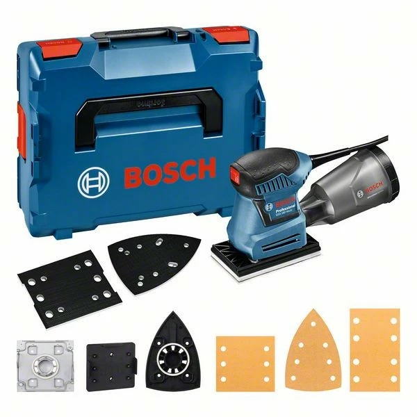 Schwingschleifer GSS 160 Multi. Der GSS 160 Professional Multi ist Boschs kompakter und ergonomischer kabelgebundener Schwingschleifer für ein breites Anwendungsspektrum, ideal auch für enge Stellen. Seine ergonomische Handablage und das kompakte Design versprechen eine einfache und bequeme Handhabung. Im Lieferumfang sind drei auswechselbare Schleifplatten enthalten, die das Arbeiten an Kanten und Ecken sowie auf kleinen flachen Oberflächen ermöglichen. Die Staubbox umfasst ein integriertes Bosch Microfilter-System für eine effiziente Staubabsaugung und nahezu staubfreies Arbeiten Der Schwingschleifer eignet sich zum Zwischenschleifen, Feinschleifen und Schleifen von Ecken und kleinen flachen Oberflächen. Er ist einsetzbar auf Holz, Furnier, Lack, Füllmasse sowie Mineral- und Acryloberflächen. Das Gerät ist mit dem Bosch Click & Clean System kompatibel. Außerdem umfasst der GSS 160 Professional Multi sowohl ein Klemm- als auch ein Klettsystem zur Schleifpapierbefestigung und er kann einhändig bedient werden. Im Lieferumfang enthalten: L-BOXX 136 (1 600 A01 2G0), L-BOXX-Einlage; Lochwerkzeug (2 608 190 059), Schraubendreher, Staubbox (2 605 411 240) inkl. Microfilter (2 605 411 241), 1x Schleifblatt C470, Best for Wood + Paint, 120 (separat erhältlich als 10er-Pack: 2 608 607 232), 1x Schleifblatt C470, Best for Wood + Paint, 120 (separat erhältlich als 10er-Pack: 2 608 607 458), 1x Schleifblatt C470, Best for Wood + Paint, 120 (separat erhältlich als 10er-Pack: 2 608 608 Z96), (Delta) Grundplatte, 100 x 150 mm (2 608 601 448) mit Schleifplatte (2 608 601 445), Grundplatte, 113 x 101 mm (2 608 601 446) mit Schleifplatte (2 608 601 443), Grundplatte, 80 x 130 mm (2 608 601 447) mit Schleifplatte (2 608 601 444)